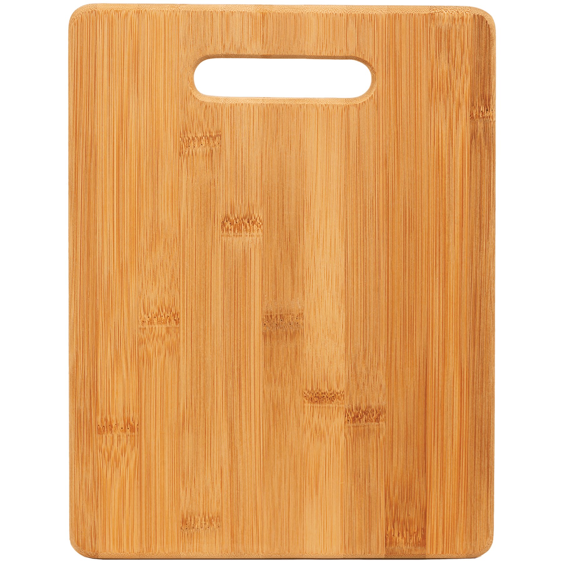 This ½" thick 11.5 x 8.75 inch bamboo cutting board features a classic rectangle shape with a built-in handle, perfect for kitchen use, charcuterie displays, or personalized gifting.