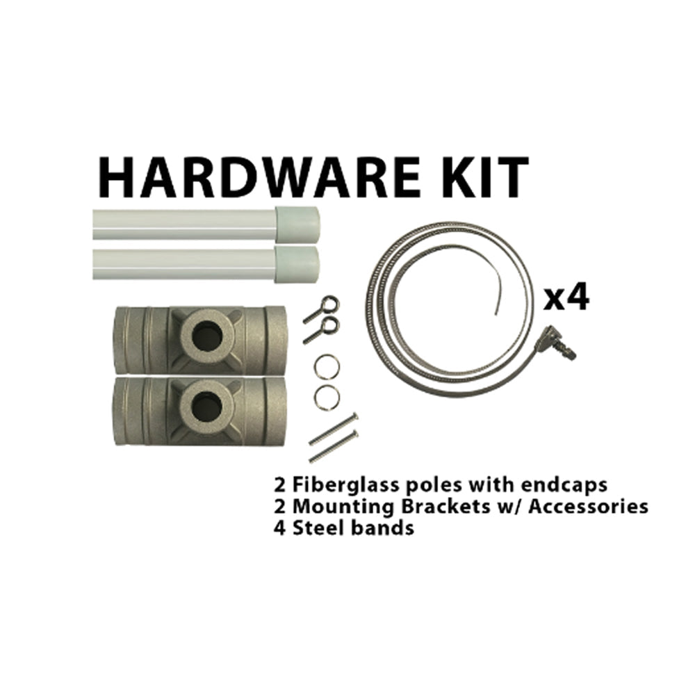 - Hardware set includes 2 Fiberglass Arms, 2 Mounting Brackets and 4 Steel Bands